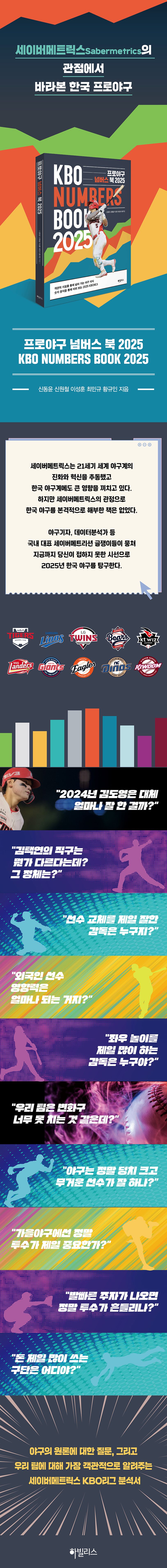 《프로야구 넘버스 북》은 세이버메트릭스(Sabermetrics)의 관점에서 한국 프로야구를 바라보고 해석하는 책이다. 세이버메트릭스가 한국 야구팬들에게 처음 소개된 때는 1990년대 중후반 PC 통신 시대. 이후 주류 미디어에서도 OPS를 시작으로 세이버메트릭스의 지표와 방법론이 소개됐다. 지금은 프로 구단 운영에도 영향을 미치고 있다. 하지만 지금까지 세이버메트릭스로 한국 프로야구를 다룬 책은 없었다.