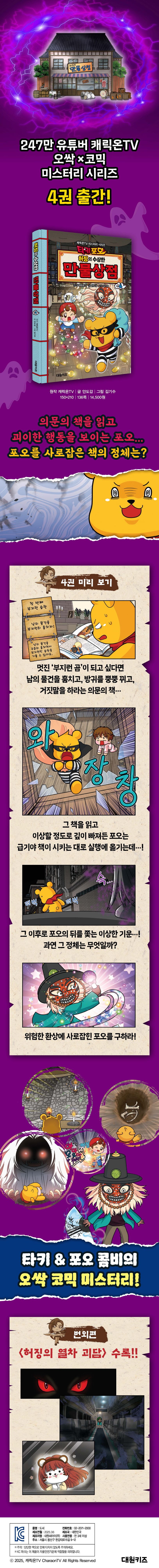 저자:캐릭온TV 의젓하고이해심많은타키와밉지않은허세곰돌이포오의유쾌하고신나는모험이야기를마인크래프트영상으로담은대한민국최고의스토리텔러크리에이터입니다.재치와유머가넘치는타키와포오의진한케미가246만구독자들에게폭발적인사랑을받고있습니다. 저자:안도감 타키와포오의모험이언제나건강하고즐거울수있도록,<허징의수상한만물상점>의글을쓰고콘티를작업했습니다.대표작으로는<타키포오코믹어드벤처>가있습니다. 그림:김기수 어린이들에게재미있고유익한만화를보여주기위해다양한작품을그리며열심히활동하고있습니다.대표작으로는<탁주쪼꼬탈출게임>,<탁주쪼꼬용사원정대>,<쿠키런킹덤>,<민쩌미>등이있습니다.