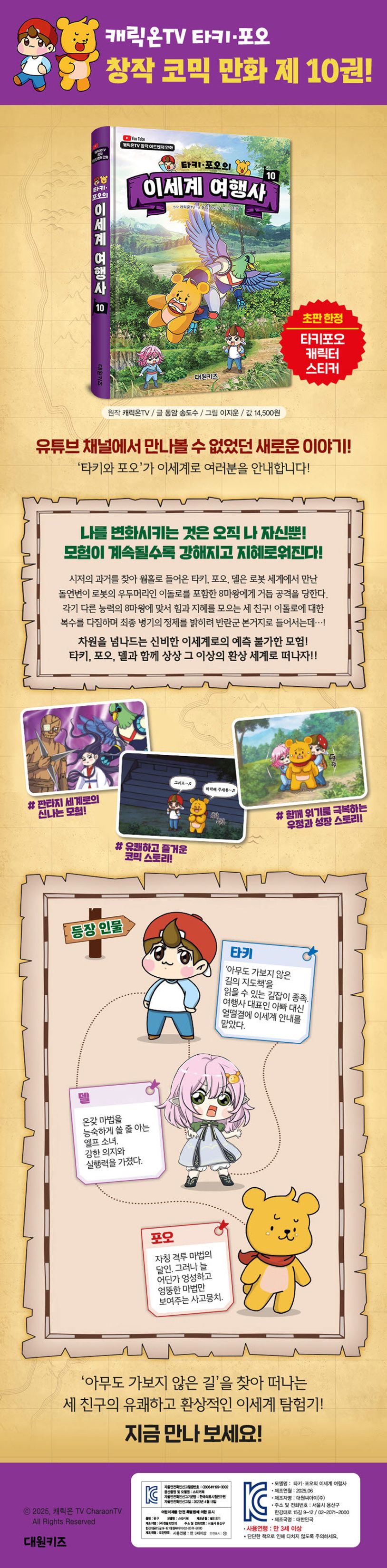 247만 구독자, 대한민국 최고의 유튜버 캐릭온TV의 ’타키와 포오‘가 이세계 여행사를 차리고 여러분을 기다립니다! 유튜브 채널에서 만나볼 수 없었던 새로운 이야기를 책으로 만나 보세요! 검증된 베스트셀러 작가를 통해 재탄생한 타키와 포오의 기상천외한 모험 이야기! 책을 읽는 사이 나도 몰랐던 탐험심, 도전 정신 UP! 서로를 돕고 이끄는 진~한 우정에 감동! 보너스로 상상력과 창의력도 업그레이드 됩니다. 독자가 인정하고 판매로 증명된 책을 직접 만나보세요!