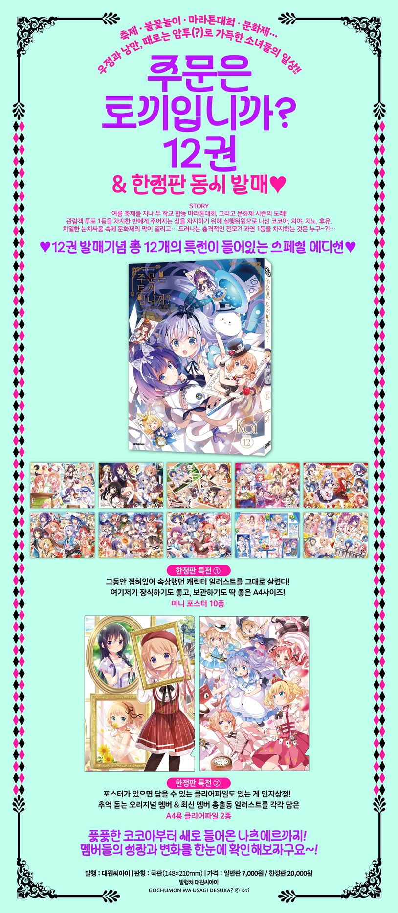 단행본에 두 페이지에 걸쳐 들어가 중앙부가 끊어진 채로밖에 볼 수 없었던 캐릭터 소개 일러스트를 독자들이 온전한 형태로 눈에 담고 소장할 수 있도록 미니포스터로 제공. 3권과 12권의 일러스트는 미니포스터를 수납할 수 있는 클리어파일로 별도 제작. 봄 느낌 물씬 풍기는 클리어파일에 주문토끼의 역사를 한눈에 볼 수 있는 소장가치 100% 한정판.