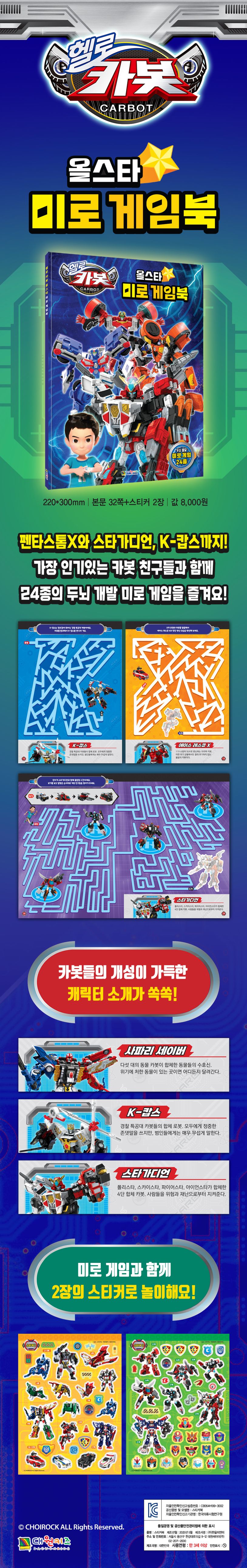 헬로 카봇 올스타 미로 게임북에서 역대 인기 카봇들을 모두 만나 보세요. 카봇 마니아만 풀 수 있는 OX퀴즈 미로, 암호 미로, 규칙 미로 등 24종의 다양한 미로 게임과 카봇들의 개성 만점 캐릭터 소개까지 알차게 담았습니다. 미로 게임 페이지에 사용하고 남는 스티커는 자유롭게 붙이며 놀이해 보세요.
