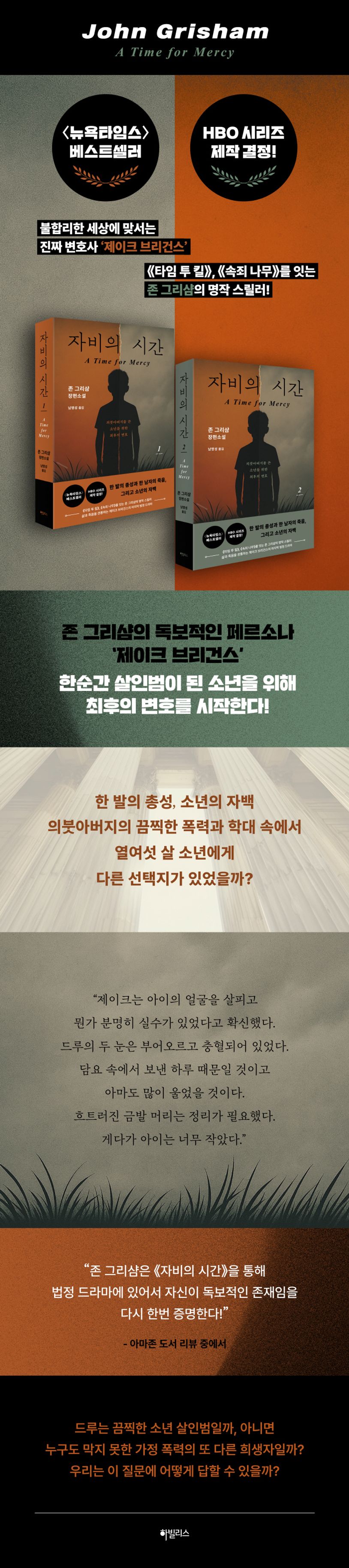 법정 스릴러의 대가인 존 그리샴은 첫 장편소설인 《타임 투 킬》을 시작으로 수많은 작품을 베스트셀러 반열에 올렸다. 또한 《펠리컨 브리프》, 《의뢰인》, 《레인 메이커》 등 수많은 작품이 영화로 제작되어 흥행에 성공했다. 실제 변호사로서 활동하기도 했던 존 그리샴은 자신의 경험과 사회의식을 작품 속에 녹여냈다. 특히 그가 창조한 캐릭터이자 페르소나인 ‘제이크 브리건스’는 불합리한 세상에 맞서 사회적 약자를 대변해온 정의로운 변호사로, 이번 《자비의 시간》에서는 의붓아버지의 폭력과 학대 속에서 힘겹게 살아온 한 소년을 돕기 위해 나선다. 열여섯 살 소년인 ‘드루’는 자신과 여동생을 지키기 위해 의붓아버지를 총으로 쏘고, 결국 체포된다. 드루의 전후 사정을 알게 된 제이크는 주변의 만류에도 불구하고 소년의 변호를 맡아 힘겨운 법정 싸움을 시작한다.