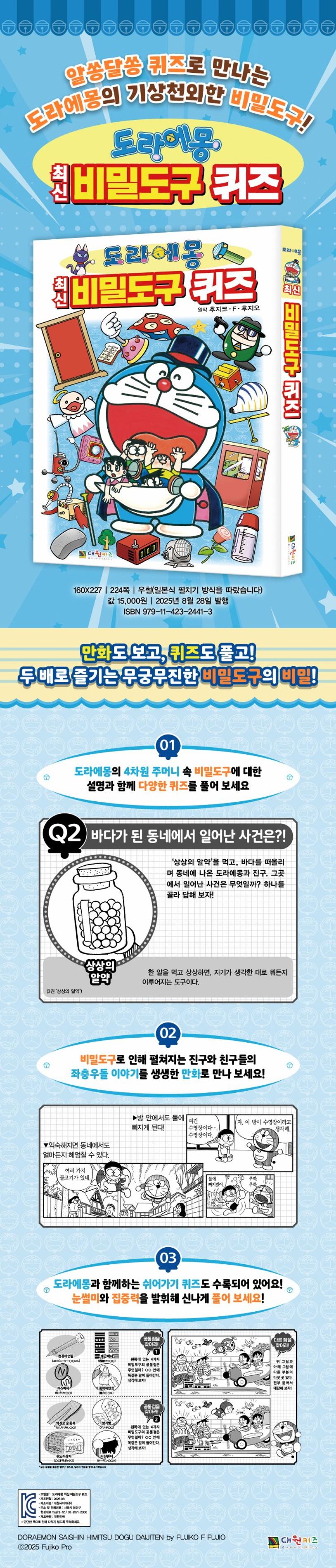 총 267가지 비밀도구를 주제로 한 148개의 퀴즈를 통해 재미와 지식을 동시에 얻을 수 있다. 도라에몽의 오랜 팬은 물론, 처음 접하는 독자도 쉽게 즐길 수 있는 구성으로, 가볍게 퀴즈를 풀며 놀다 보면 어느 새 비밀도구 박사가 되어 있는 자신을 발견하게 될 것이다.