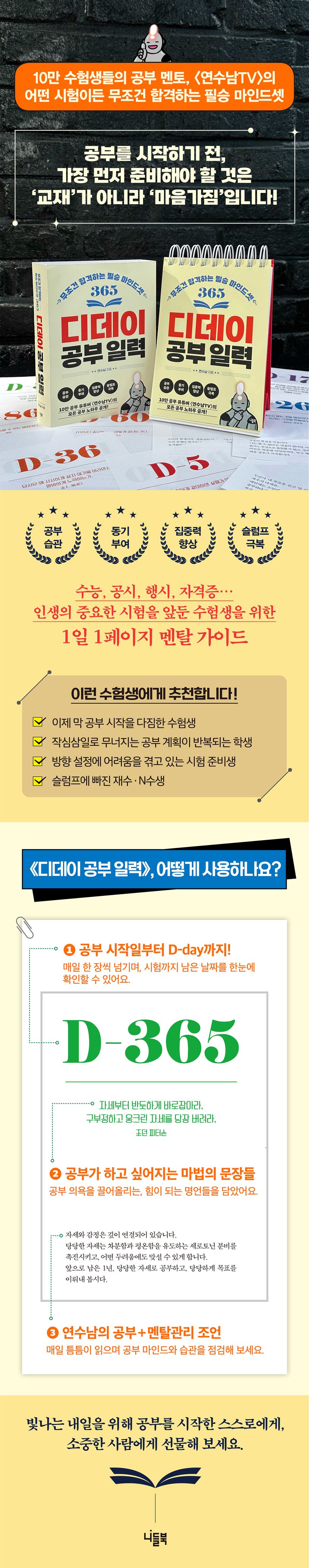 연세대 공대 수석 졸업자, 현직 최상위권 대학병원 교수이자 10만 공부법 유튜버로 수많은 수험생들의 고민을 함께 나누고 있는 연수남이 《디데이 공부 일력》과 함께 공부 페이스메이커로 당신의 D-day까지 함께한다.