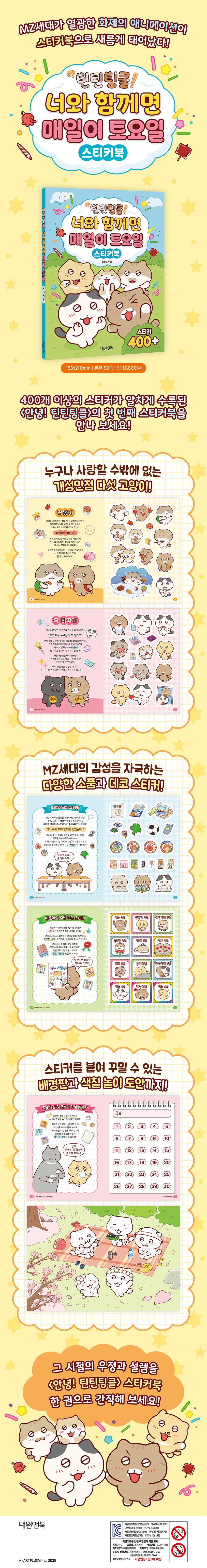 인기 인스타툰에서 애니메이션으로 재탄생한 〈안녕! 틴틴팅클〉이 첫 번째 스티커북으로 돌아왔어요. 세상에 둘도 없는 ‘베프’ 틴틴이와 팅클이, 표현은 서툴지만 착한 콩물이, 책임감 강한 언니 베리와 언니를 가장 좋아하는 동생 미니까지! 애니메이션 속 장면들과 함께 다섯 고양이가 풀어나가는 아기자기한 일상과 추억 이야기를 스티커로 만나볼 수 있습니다.