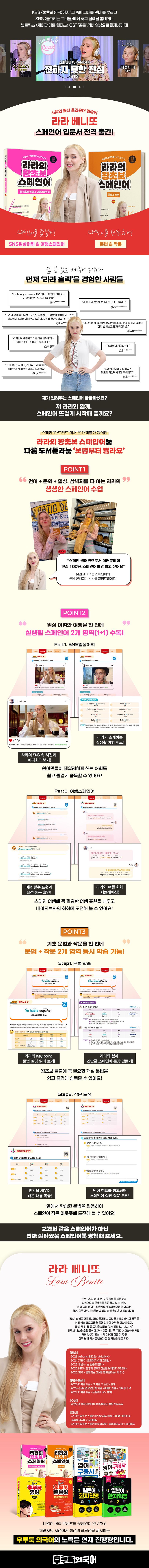 K-예능을 통해 한국 대중에게 익숙한 스페인 출신 방송인 라라 베니또가 드디어 스페인어 입문서로 찾아왔습니다. 연기, 노래, 예능에 이어, 이번엔 언어학 전공자의 내공을 담은 진짜 ‘왕초보 맞춤 스페인어 책’을 선보입니다.