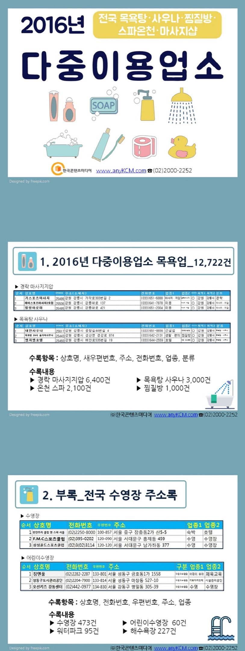 『다중이용업소(2016)(CD)』는 총 1만 2000건의 목욕업체, 목욕탕, 사우나, 찜질방, 온천 스파, 수영장 주소록이 수록된 CD이다.