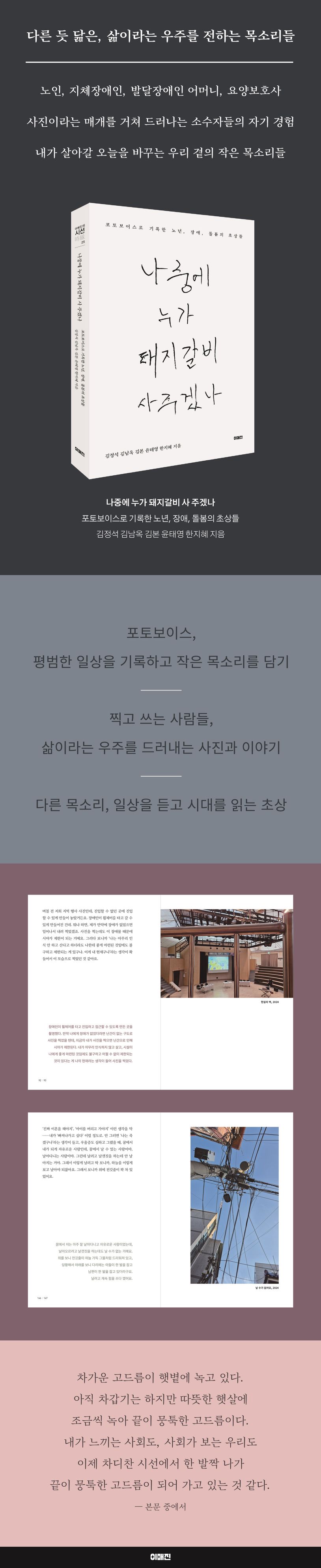 《나중에누가돼지갈비사주겠나》를구성하는각부는포토보이스활동대상에따라구분된다.1부‘뒤도돌아보고,옆사람도보고,하늘도보고’는완연한노년을맞은70대고령자들의일상을소개한다.2부‘여여한삶,그리고나’에서는전동휠체어를사용하는중년지체장애인이들려주는인생이야기를따라간다.3부‘언제나짝사랑하듯팔짱을낀다’는발달장애인을키우는어머니들눈에비친나와자녀의삶을다룬다.마지막4부‘내미래를향한동행’은요양보호사가전하는돌봄현장이야기다.