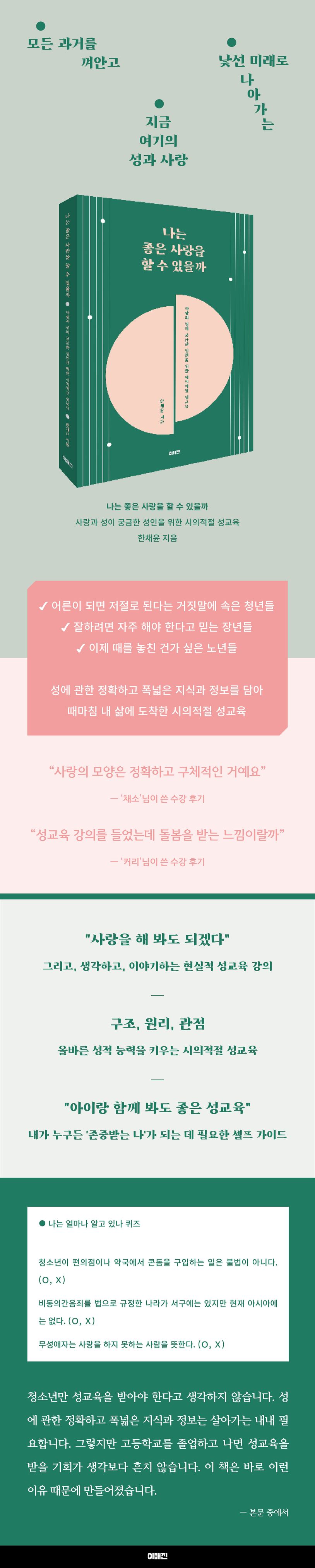 청소년부터노인까지다양한성폭력과성범죄는왜끊이지않을까?학교에서성교육을받아도왜문제는해결되지않을까?차별과혐오를걷어낸제대로된성교육을받지못한탓은아닐까?학교에서성교육받을기회를놓친이,성교육을충분히못받아아쉬운이,나이들어도사랑과연애와섹스가어려운이,성을공부하고가르치면서도종종허전하고불안한이까지성과사랑을고민하는성인을위해마련된성교육강의가있다.참여연대부설‘아카데미느티나무’에서2020년시작한‘내인생의시의적절한성교육’이다.매번신청자가몰리는인기강의를6년째진행하는이는성소수자인권활동가이자성교육전문가한채윤이다.한채윤이그동안쌓은성교육노하우를담아《나는좋은사랑을할수있을까》를펴냈다.