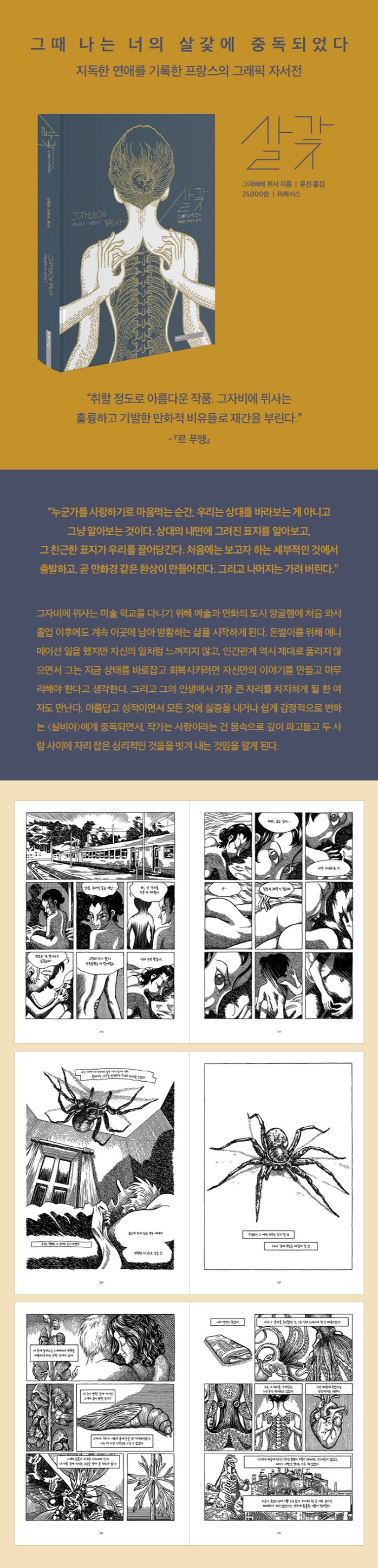 『살갗』은 작가의 두 번째 그래픽노블 작품이다. 작가가 데뷔작 『성가족』에서 자신과 가족 간의 관계를 풀어냈다면, 이번에는 더 나아가 가족과 떨어져 나온 이후 그리고 한 여자를 만나서 지독한 연애를 하고 끝을 본 이야기를 상세하게 보여 준다. 그 세월이 무려 16년이다. 뮈사는 미술 학교를 다니기 위해 예술과 만화의 도시 앙굴렘에 처음 와서 졸업 이후에도 계속 이곳에 남아 방황하는 삶을 시작하게 된다. 돈벌이를 위해 애니메이션 일을 했지만 자신의 일처럼 느껴지지 않고, 인간관계 역시 제대로 풀리지 않으면서 그는 지금 상태를 바로잡고 회복시키려면 자신만의 이야기를 만들고 마무리해야 한다고 생각한다. 그리고 그의 인생에서 가장 큰 자리를 차지하게 될 한 여자도 만난다. 아름답고 성적이면서 모든 것에 싫증을 내거나 쉽게 감정적으로 변하는 <실비아>에게 중독되면서, 작가는 사랑이라는 건 몸속으로 깊이 파고들고 두 사람 사이에 자리 잡은 심리적인 것들을 벗겨 내는 것임을 알게 된다.