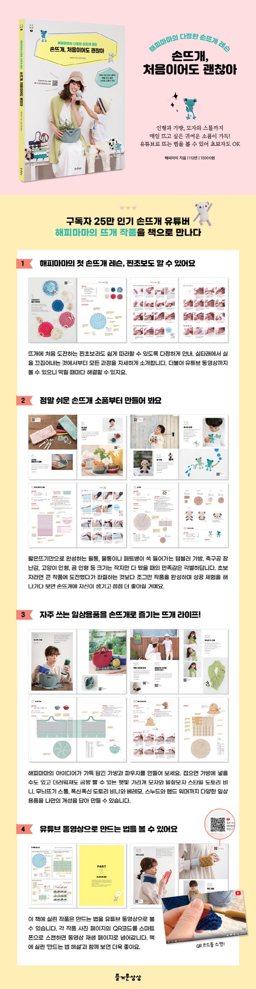 인기가 많은 손뜨개 작품과 단시간에 완성할 수 있는 작품을 중심으로 담았습니다. “다 만들었다!”라는 성취감을 “손뜨개가 좋아!”로 연결하고 싶은 제 마음을 담아 작품을 골랐습니다. 뭔가 떠 보고 싶을 때 이 책을 들춰보면 어느 계절이든 뜨고 싶은 작품을 찾을 수 있을 거예요. 손뜨개, 처음이어도 괜찮아요! 지금부터 즐겁고 행복한 손뜨개를 시작해 보세요!