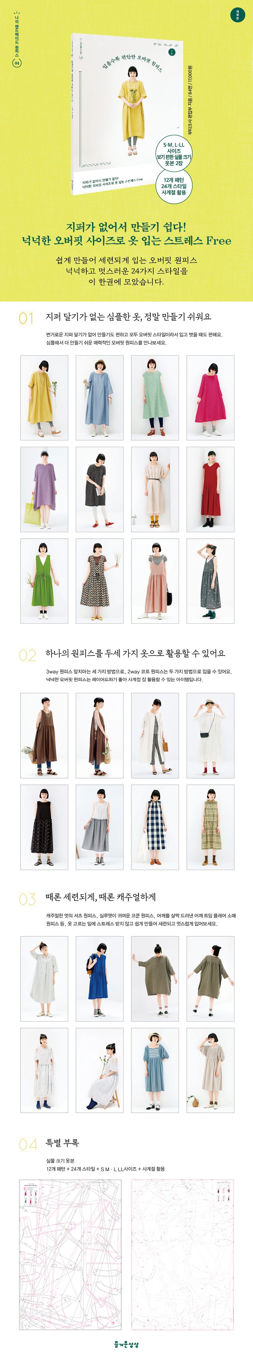 《입을수록 편안한 오버핏 원피스》는 최신 트렌드 ‘오버핏 원피스’ 24가지를 담은 책입니다. 입기 편한 A라인 원피스나 귀여운 코쿤 실루엣 원피스, 입는 방법에 따라 두 가지 혹은 세 가지로 변신이 가능한 원피스 앞치마, 코트 앞치마 등 실용적이면서도 디테일을 살린 여러 디자인의 오버핏 원피스가 가득합니다.