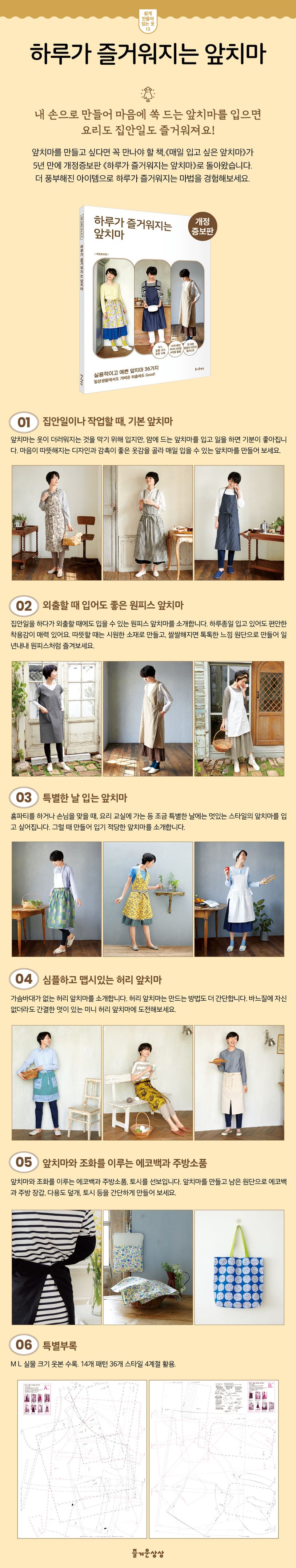 내손으로만들어마음에쏙드는앞치마를입으면요리도집안일도즐거워져요!내손으로만든앞치마를입고기분좋은시간을즐겨요집정리와청소,요리,빨래…….매일반복되는일상생활에서즐거움을찾고싶은분에게앞치마를직접만들어입어보기를권합니다.입기편한실용적인앞치마,가벼운외출에도좋고홈파티에도어울리는멋스러운앞치마만드는법을소개합니다.촉감이나입었을때의느낌도꼼꼼하게따졌답니다.내손으로만들었기에더욱만족스러운앞치마로기분좋은시간을즐겨보세요.앞치마는옷만들기에비해쉽고간단합니다.핸드메이드의장점인‘완성품을만들어내는재미’를느낄수있습니다.집안일이나작업할때,기본앞치마10가지앞치마는옷이더러워지는것을막기위해입지만,맘에드는앞치마를입고일을하면기분이좋아집니다.마음이따뜻해지는디자인과감촉이좋은옷감을골라매일입을수있는앞치마를만들어보세요.유행을타지않는기본적인스타일의앞치마로꽃무늬,스트라이프,북유럽풍프린트,민무늬옷감등으로만든기본앞치마10가지를소개합니다.앞치마를여미는방법도다양합니다.끈을묶지않고어깨끈을교차할수도있고,뒤판은앞에서앞판은뒤에서끈을묶어체형과상관없이몸에맞게조절할수있는방법도소개되어있습니다.좋아하는패턴의촉감좋은원단을골라만드는법을보며따라만들어보세요.외출할때입어도좋은원피스앞치마10가지집안일을하다가외출할때에도입을수있는원피스앞치마를소개합니다.하루종일입고있어도편안한착용감이매력있어요.브이넥원피스앞치마는무릎까지오는길이로레깅스나바지위에입어도잘어울리고짧은길이의원피스앞치마는풍성한스커트나바지와겹쳐입어도날씬하게보여일상복으로입어도손색이없어요.더블거즈나부드러운면으로원피스앞치마를만들어레이어드해서입으면집안일할때도,집앞가벼운외출에도그차림그대로좋아요.날씨가따뜻할때는시원한소재의원단으로만들고,쌀쌀해지면톡톡한느낌원단으로만들어일년내내원피스처럼즐겨보세요.특별한날입는앞치마8가지홈파티를하거나손님을맞을때,요리교실에가는등조금특별한날에는멋있는스타일의앞치마를입고싶어집니다.그럴때만들어입기적당한앞치마를소개합니다.허리부분에풍성한주름을잡거나가슴바대와치마에민무늬와줄무늬로패턴에변화를주어프릴이나리본을더해디테일을살려주었어요.홀터넥처럼목뒤에서끈을묶도록한카슈쾨르스타일의세련된앞치마와잔꽃무늬,프릴로포인트를준앞치마는손님을대접하는자리에잘어울려요.심플하고맵시있는허리앞치마8가지가슴바대가없는허리앞치마를소개합니다.북유럽스타일꽃무늬원단으로허리에주름을넉넉하게잡은단순한디자인이매력적인앞치마는무릎까지오는길이라서편하게입을수있고,길이를좀짧게해서무릎위로오는길이는집안일할때더맵시가납니다.아이보리민무늬로만든심플한허리앞치마는카페스타일앞치마로앞쪽에넉넉한양쪽주머니가있어작업용으로편리해요.허리앞치마는만드는방법도더간단합니다.바느질에자신없더라도간결한멋이있는미니허리앞치마에도전해보세요.앞치마와조화를이루는에코백과주방소품이책은여러가지용도별스타일별앞치마36가지를올컬러사진과함께만드는법까지친절하게소개합니다.더불어앞치마와조화를이루는에코백과주방소품,토시를선보입니다.앞치마를만들고남은원단으로에코백과주방장갑,다용도덮개,토시등을간단하게만들어보세요.앞치마와같은패턴의소품이조화를이루어더즐겁게집안일을할수있습니다.