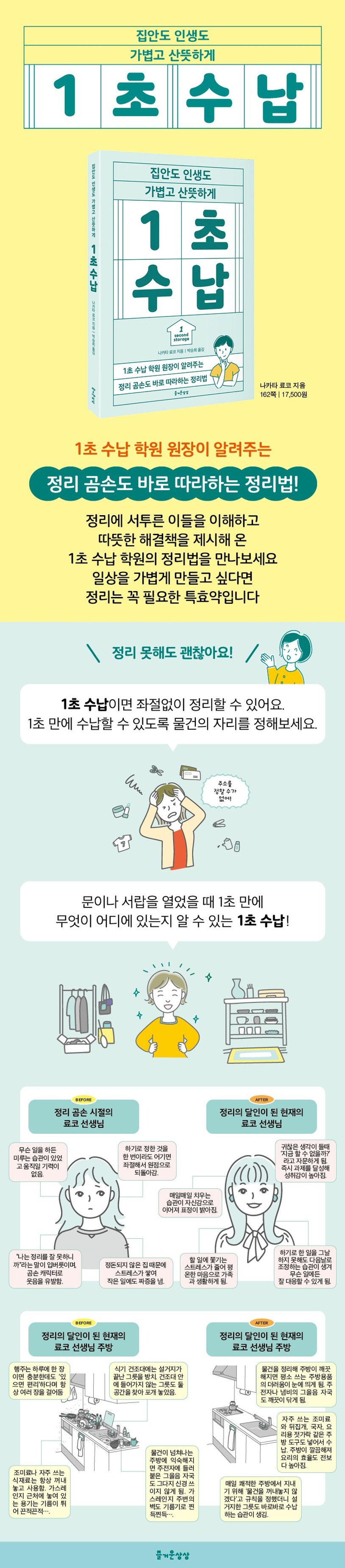 정리곰손의심리를해부한다저자는정리곰손의심리를분석합니다.정리곰손은창고방을만들고애써모른척하거나각종이유로‘미루기’를합리화합니다.물건을꺼내기만하고제자리에되돌려놓지못하지요.정리를시작했다가도다른일에금세마음을빼앗겨버리기일쑤입니다.아깝다는감정에사로잡히거나다정하고겁이많은성격탓에물건과이별을힘들어합니다.정리를시작하기만하면알레르기증상이나타나몸컨디션이안좋아지기도하지요.정리곰손이반복적으로빠지는함정인“왜나는정리를시작하지못하는가”,“왜항상중간에포기하는가”에대한답을뇌과학과심리학의관점에서풀어내며해결책을제시합니다.정리는기술이아니라습관입니다정리실패의이유를알았다면성공요령을배울차례입니다.저자는정리개념을다시만들어가는‘빌리프노트’고쳐쓰기,어디서부터시작해야할지모르는완벽주의자를위한접근법,무리없이지속가능한‘15분리셋정리’,정리알레르기극복을위한‘타이머1분정리’,정리하다딴생각이나면바로‘기록하기’,부담없이정리를습관화하는간단한규칙,깨끗해진집을유지하고다시어질러지지않게하는노하우등바로따라해볼수있는방법이많습니다.‘언젠가쓸지몰라’보다‘지금당장쓰기’를권하고바쁘고힘든시기인연말대청소보다‘대청소는봄에하라’는현실적인제안도담았습니다.정리가인생을바꿉니다마지막으로『1초수납』은정리가삶전반에미치는변화를이야기합니다.정리를통해일과가정,육아까지자연스럽게정돈되고,미루는습관이사라지며,자기긍정감이회복되는과정을실제사례로보여줍니다.또한다이어트와정리를연결해설명하며‘요요없는정리’를가능하게하는법을제시하지요.각장말미에는정리곰손에서벗어난사람들의실제경험담을만화로구성해서공감하며재미있게읽을수있습니다.이책은‘정리때문에좌절한사람을위한책’입니다.수많은학원수강생이삶을바꿔나가는모습을직접확인한저자는집은물론마음까지가볍게정돈하고싶은이들에게현실적이고따뜻한해결책을제시합니다.