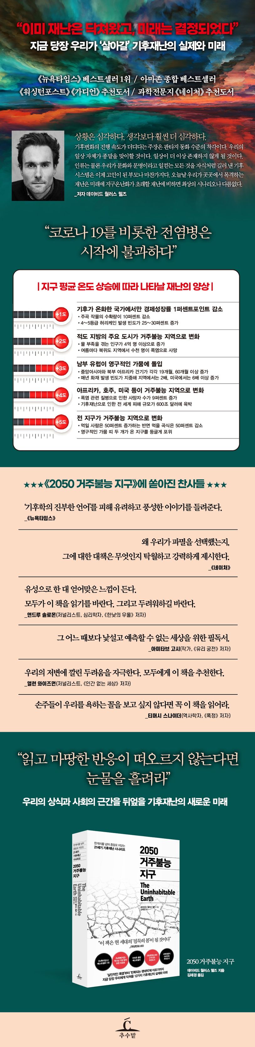 ‘지구의 날’ 50주년을 맞이해 출간되는 『2050 거주불능 지구』는 최신 연구 자료와 통계적 근거를 바탕으로 가장 믿을 만한 기후변화의 미래 시나리오를 제시한다. 기존 기후변화와 관련한 다양한 논의들을 비판적으로 종합해 우리의 일상을 파괴할 지구온난화의 실제적인 영향과 그림을 제시한다. 단순한 ‘환경운동’이나 개인의 윤리적 각성으로도 해결할 수 없는 기후변화의 막대한 영향력을 규명하는 이 책은 걷잡을 수 없는 전염병 등으로 총체적 위기를 맞이한 인류 사회가 반드시 참고해야 할 기후재난 대응 매뉴얼이자 미래보고서다.