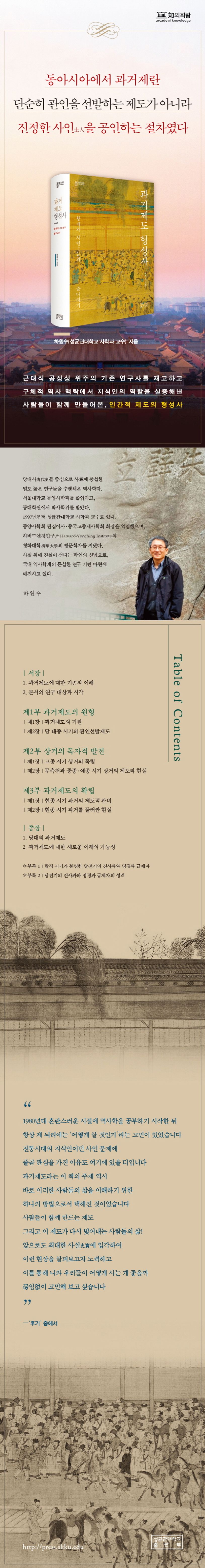 요컨대 양자 사이의 미묘한 긴장 관계 속에서 진사과(進士科)에 응시하거나 급제한 사인들의 주체적 능동성이 두드러지고, 과거제도는 실질적으로 이들이 원하는 방향으로 전개되었다. 이 책이 ‘근대적’ 공정성이나 황제 중심의 전제국가 위주로 이해되어온 기왕의 연구사를 재고하고, 과거가 만들어지던 당시의 구체적인 역사 맥락 속에서 이 제도를 새롭게 점검할 수 있는 토대가 되는 이유다.