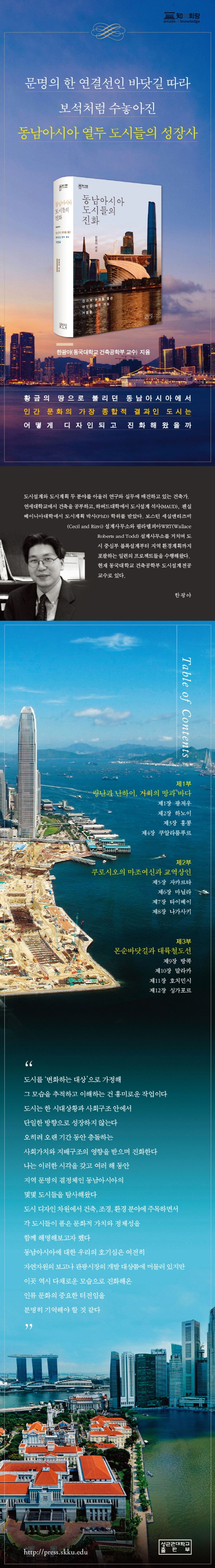 이 책은 홍콩, 하노이, 호치민시, 방콕, 마닐라, 자카르타, 쿠알라룸푸르, 말라카 그리고 싱가포르까지, 대표적인 동남아시아 도시들의 형성과 진화 과정을 다룬 탐사 보고서다. 건축ㆍ조경ㆍ환경 등 도시 디자인 차원의 변모에 초점을 맞추면서 역사ㆍ지리ㆍ문화 등 인문 차원의 변화까지 포괄적으로 재조명했다. 인류 문명의 한 연결선인 바닷길을 따라 보석처럼 수놓아진 도시들의 성장사가 현대 도시계획 분야의 전문가인 저자의 시선에서 재정의된다.
