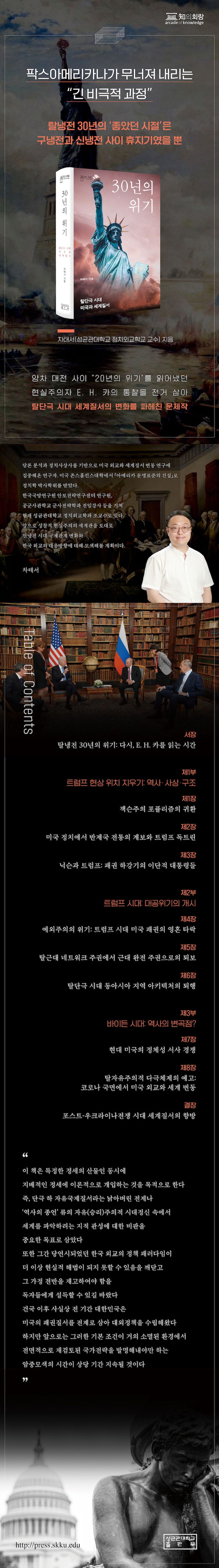 신간 『30년의 위기』는 국제정치학의 고전이 된 『20년의 위기』를 준거로, 양차 대전 사이 20년과 구냉전과 신냉전 사이 30년을 비교ㆍ분석하면서 우리 시대의 고유한 국제정치적ㆍ역사적 국면 변화에 집중한 책이다. 미국 중심의 패권구조가 침식되고 자유주의적 세계 비전이 소멸해가는 가운데, 지정학적 경쟁이 귀환하고 비자유주의적 사회 세력이 고양되는, 탈냉전 30년 세계질서 변화의 궤적이 현실감 있게 재구성되어 있다. 무엇보다 미국의 정치운동과 사상의 계보를 관통하며 팍스아메리카나의 해체 과정을 추적하는 서사와 서술은 탈냉전 ‘30년의 위기’에 대한 설득력 있는 인사이트를 제공한다.