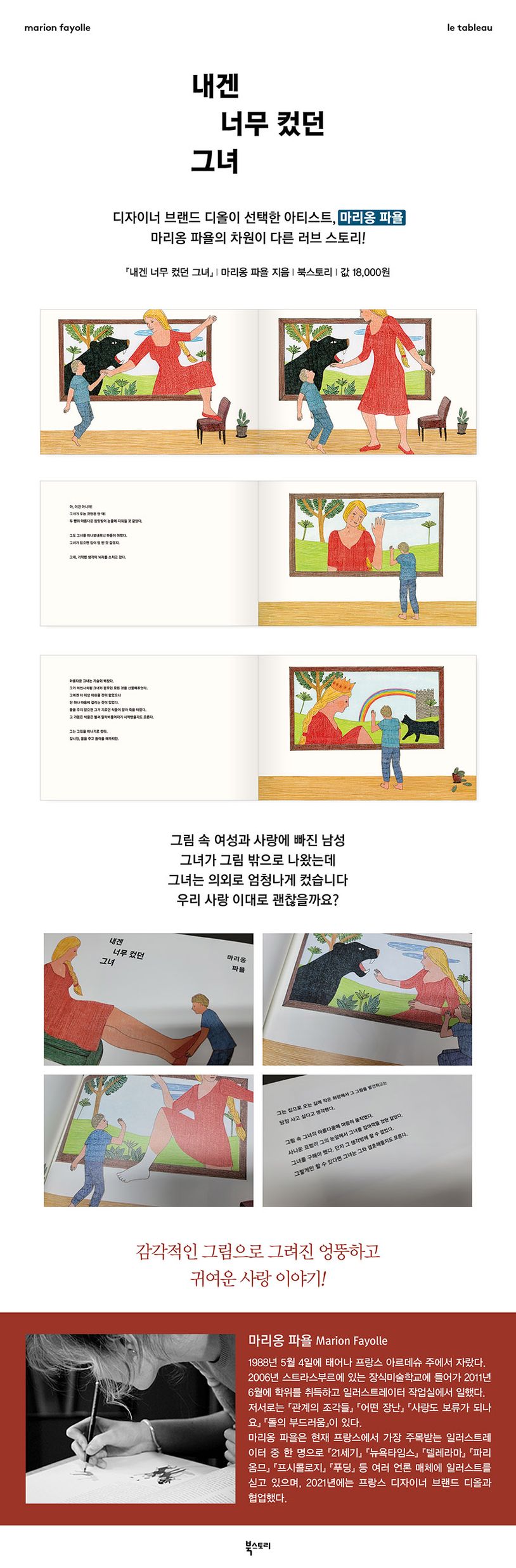 관계에 대한 유머러스한 통찰력이 돋보이는 『관계의 조각들』, 연인 간의 사랑을 다양한 메타포로 그려낸 『어떤 장난』, 앙굴렘 페스티벌 그랑프리 수상작인 『사랑도 보류가 될까요』, 아버지의 죽음을 차분하게 그려낸『돌의 부드러움』에 이어 소개되는, 『내겐 너무 컸던 그녀』는 마리옹 파욜 특유의 세련된 그림과 이야기가 담긴 감각적인 그림책이다. 『내겐 너무 컸던 그녀』로 현재 프랑스를 대표하는 일러스트레이터로 떠오른 마리옹 파욜의 매력에 빠져보자.