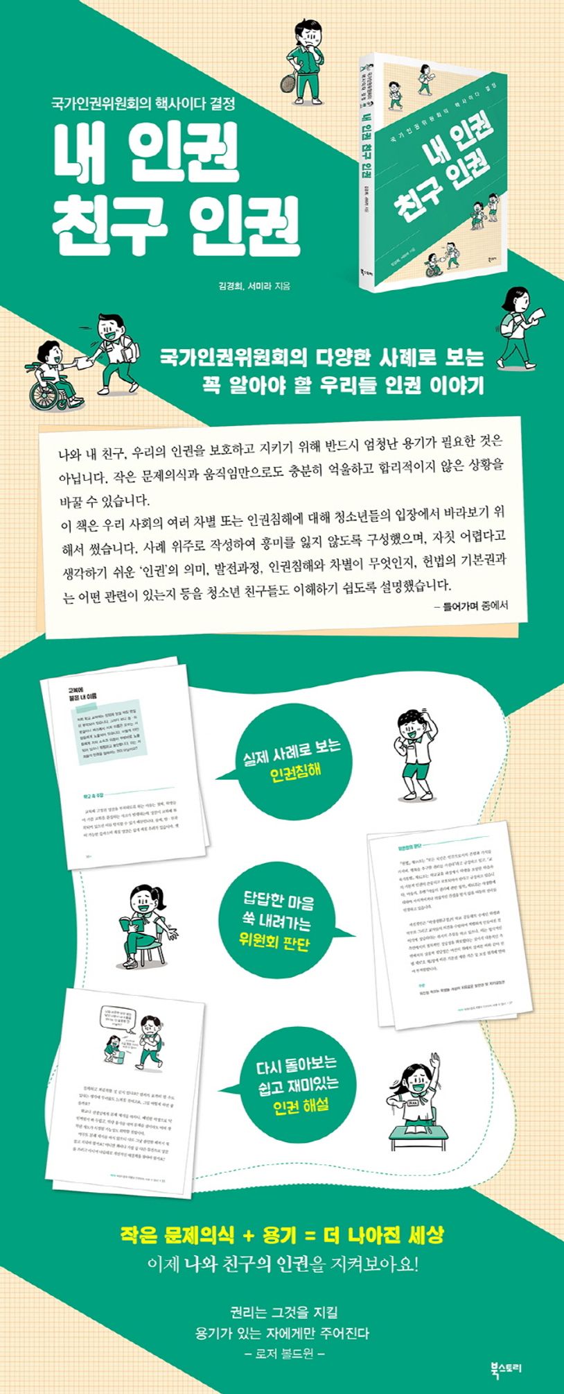 국가인권위원회는 2001년 설립 이후 인권 보호·증진에 앞장서서 차별과 인권침해에 브레이크를 걸어왔다. 불편해하는 소수의 목소리가 짓밟히지 않도록 귀를 기울여온 국가인권위원회의 다양한 사례를 통해 인권이 무엇인지, 나와 친구의 인권을 보호하려면 어떻게 해야 하는지를 청소년들과 함께 생각해보는 책 『내 인권 친구 인권』이 북스토리 출판사에서 출간되었다.