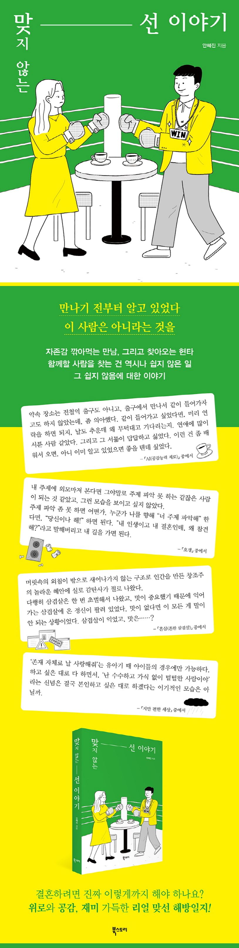 이 부자연스러운 만남에 대한 생생한 리얼 체험담 『맞지 않는 선 이야기』가 북스토리에서 출간되었다. 저자는 맞선에서 받았던 상처를 남들과 공유하기 쉽지 않기에, 위로와 공감이 필요할 때 받을 수 없었음을 떠올렸다. 그래서 자신이 겪었던 맞선과 소개팅에 대해 써내려갔다. 섬세하면서도 시원한 필치로 그려낸 이 책에 담긴 생생한 만남 이야기들을 따라 가다 보면 현실이 픽션보다 훨씬 재미있을 수도 있다는 말에 절로 고개가 끄덕여진다.