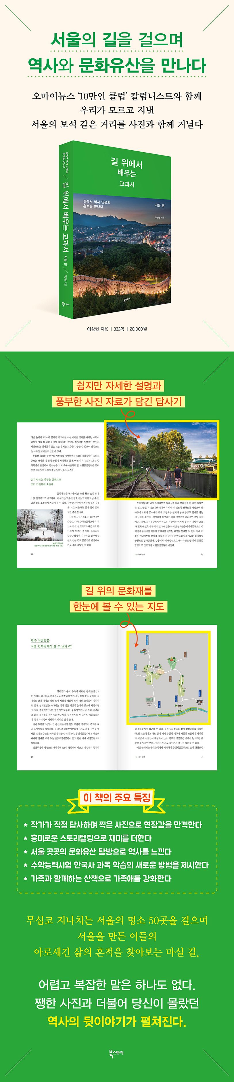 서울은 역사와 문화의 보물로 가득한 도시다. 이 책은 작가가 직접 찍은 현장감 넘치는 사진과 함께, 서울을 산책하면서 배울 수 있는 흥미로운 역사와 문화 이야기를 담고 있다. 이제 《길 위에서 배우는 교과서-서울 편》을 통해 그 풍요로운 유산을 탐험해 보자.