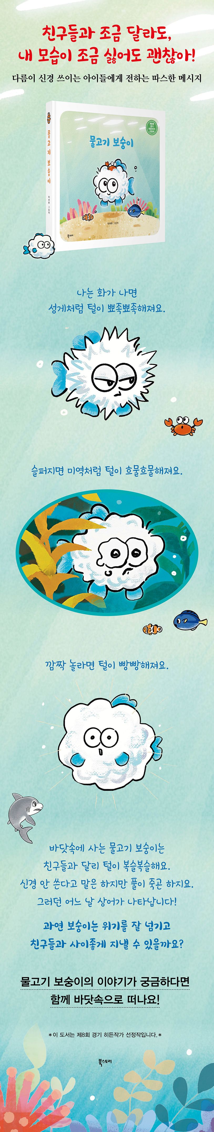 보숭이는 화가 나면 성게처럼 뾰족뾰족해지는 털, 슬퍼지면 미역처럼 흐물거리는 털을 가진 채로 매일매일을 보내고 있었어요. 그러던 어느 날, 평화로운 바닷속에 상어가 나타나고 깜짝 놀란 친구들은 모두 도망을 갑니다. 함께 도망을 가던 보숭이는 그만 상어와 딱 마주치고 말죠. 털이 빵빵해질 만큼 놀란 보숭이! 과연 보숭이는 친구들을 지키고 위기를 잘 헤쳐 나갈 수 있을까요? 그리고 털복숭이라고 놀리던 친구들과 사이좋게 지낼 수 있을까요?