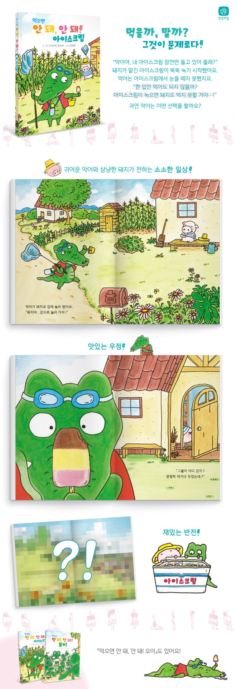 돼지가 먹고 있던 아이스크림을 악어에게 맡겼어요.