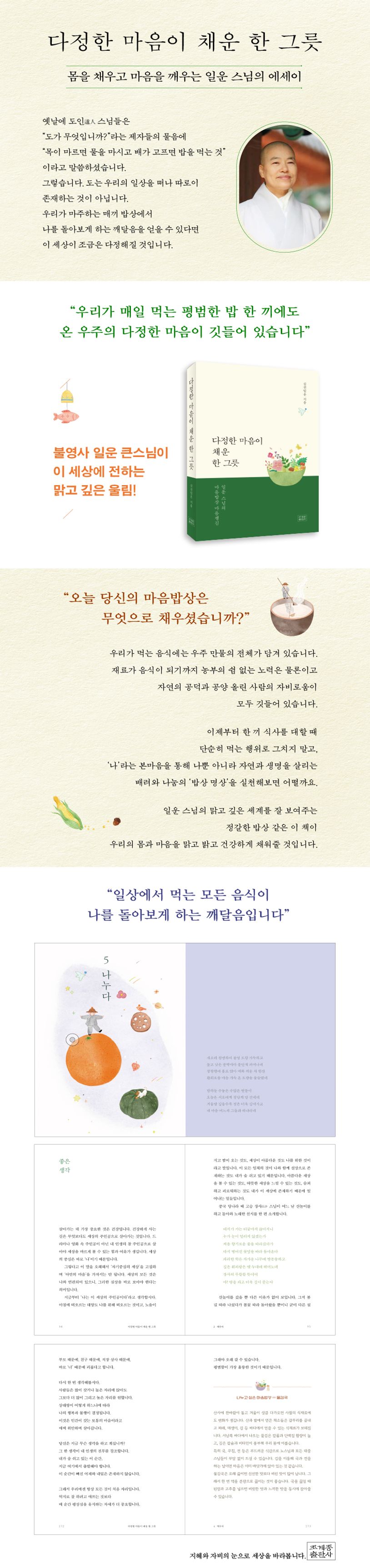 ‘음식을 먹는 일이 곧 수행’임을 깨달아가는 이번 여정에서, 스님은 무엇을 먹어야 건강할 수 있는가가 아닌, 어떻게 먹어야 우리 삶을 좀 더 풍요롭게 만들 수 있는가를 ‘살피고, 채우고, 비우고, 깨우고, 나누는’ 일상의 모든 순간에서 함께 생각하고 고민해나간다.