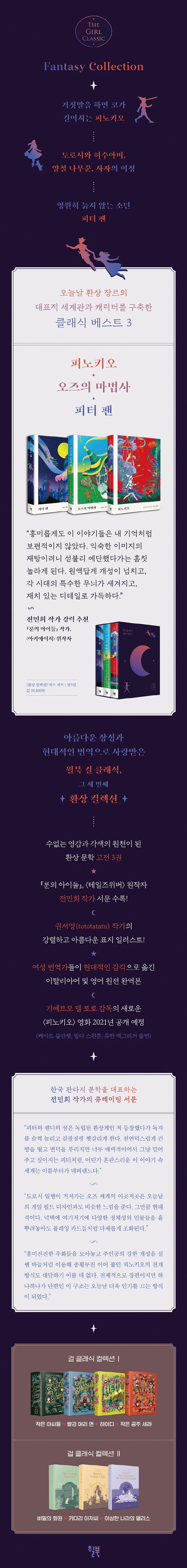 거짓말을 하면 코가 길어지는 주인공으로 너무도 유명한 환상 문학의 고전 『피노키오』가 ‘걸 클래식 환상 컬렉션’의 한 권으로 번역되었다. 거침없는 상상력으로 엮어낸 이 동화에서는 생생한 캐릭터의 힘와 유머, 문학적으로 혁신적인 구조, 당대에 대한 날카로운 현실인식을 동시에 볼 수 있다. 어른이 되어 다시 읽는 고전에는 어린 시절의 나와 지금의 나를 함께 느끼게 하고, 생각해보게 하는 힘이 있다.