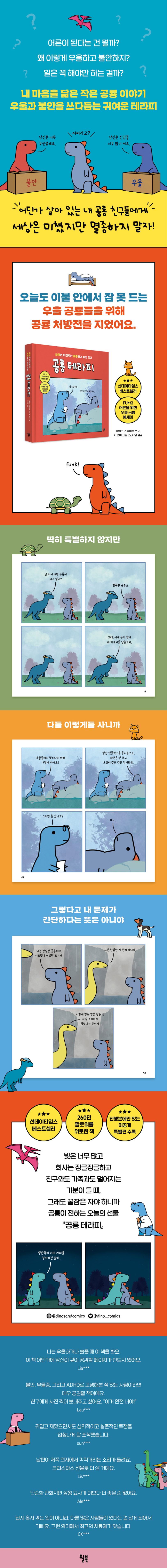 “나는 행복한 공룡이 되고 싶어요.” “그래, 좋아. 이제 네 기대치를 낮춰보자.” 무책임하게 위로하지도, 함부로 냉소하지도 않는 난생처음 보는 공룡 에세이. 단순한 그림체와 간결하면서도 뼈 있는 글로 전 세계 140만 어른이들을 껴안아 준 화제의 만화가 드디어 책으로 나왔다. 웃기지만 씁쓸하고, 솔직하지만 따뜻한 이 공룡들의 문답은 엉망인 세상 속 멸종하고 싶지 않은 우리 이야기이기도 하다. 우울, 불안, 무기력, 외로움, ADHD… 내 안에는 어떤 이름의 공룡이 있을까? 어른이 되느라 애써 모른 척 했던 우리 안의 연약한 공룡들을 끄집어내 찬찬히 바라보자. 혼자가 아니라는 안도와 미소가 절로 나온다.
