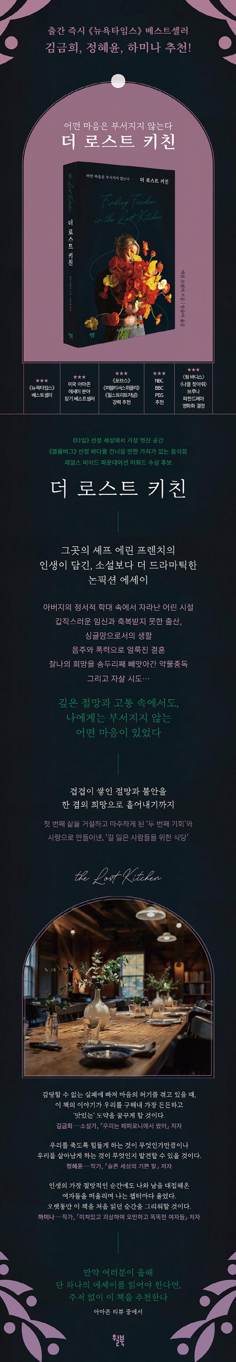 에린 프렌치의 인생을 담은 이 책은 한 식당과 셰프의 성공 스토리라기보다, 끝없이 펼쳐진 절망과 고난 속에서 힘껏 발버둥 친 끝에 결국 완벽한 자유를 찾아낸 한 사람, 그리고 그토록 치열하게 희망으로 이뤄낸 온기 어린 공간에 대한 이야기다. 그가 전하는 진솔하고 내밀한 고백에 수많은 독자가 절절한 공감과 깊은 응원을 보내온 이유는, 이 책이 우리 모두에게 필요한 ‘두 번째 기회’, 그리고 ‘깊은 절망에도 우리를 살아가게 하는 어떤 것’에 대한 이야기를 담고 있기 때문이다. 다시 말해, 저자가 실제로 운영하는 식당의 이름이자 이 책의 제목이기도 한 ‘더 로스트 키친’은 과거의 자신처럼 어둠 속에서 헤매고 있을 누군가를 안아 일으킬 ‘길 잃은 사람들을 위한’ 희망의 기록이다. 각자 다른 방식으로 실패 속에서도 무너지지 않고 나아가는 일의 중요함을 이야기해온 3명의 여성 작가 김금희, 정혜윤, 하미나 작가가 이 책을 강력 추천하며 찬사를 보냈다.