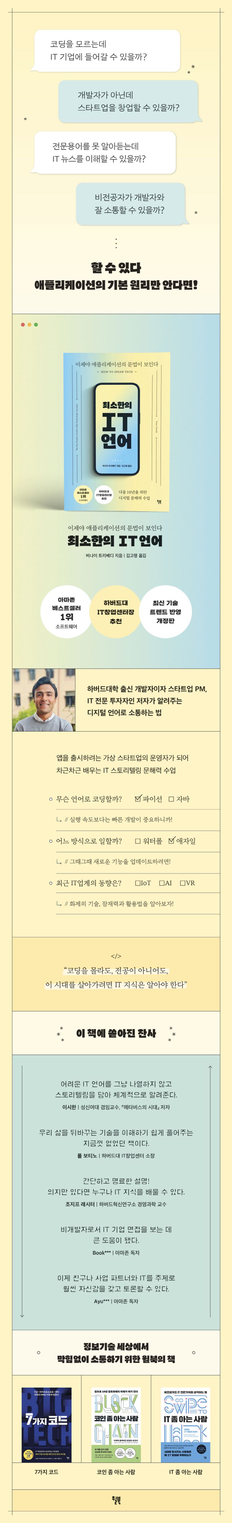 이렇게 『최소한의 IT 언어』는 미국 아마존 소프트웨어 분야(Software Programming Compilers) 베스트셀러 1위에 올랐고 미국과 유럽의 고등학교, 대학교, 코딩 부트캠프에서 교재로 활용되며 많은 사랑을 받아왔다. 개정판에서는 IoT, AI, 블록체인, 메타버스와 같은 업계의 최신 동향까지 다루며 내용을 강화했다.
