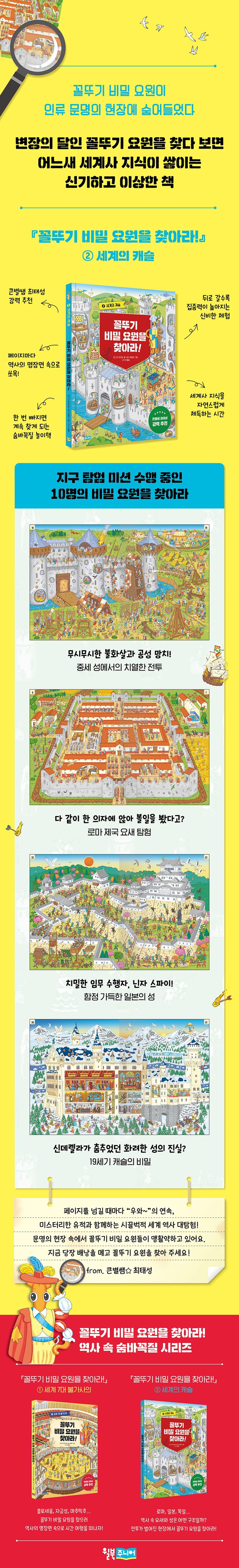 로마 제국의 요새부터 모트 베일리 요새, 중세 성에서의 생활과 공성전, 일본 성, 보루 요새, 19세기 성까지 시간을 넘나들며 세계의 다양한 캐슬과 그 안의 삶을 소개한다. 역사 속 한 장면으로 들어가 변장한 꼴뚜기 요원을 발견하는 체험형 놀이책이자 세계사 익힘책이다.