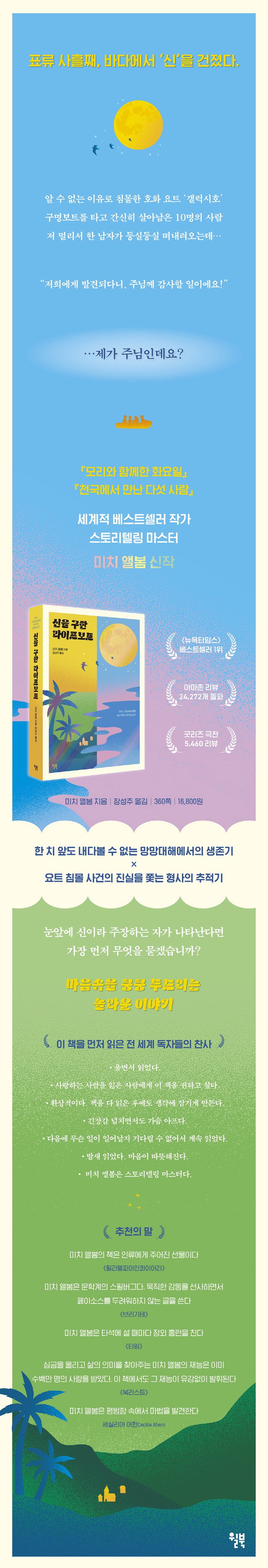 “만약 당신 앞에 ‘신’이 나타난다면 당신은 어떤 질문을 가장 먼저 하겠습니까?” 『모리와 함께한 화요일』의 작가 미치 앨봄의 강렬한 신작 『신을 구한 라이프보트』가 나왔다. 모종의 사건으로 침몰한 ‘갤럭시호’. 침몰하는 요트에서 열 명의 사람들이 살아남아 라이프보트에 간신히 올라탄다. 구조대는 보이지 않고 식량도 다 떨어져가던 표류 나흘째, 한 남자를 바다에서 건지는데… 구조된 남자는 물에 빠진 생쥐 꼴을 하고서 허겁지겁 음식과 물을 받아먹는다. 그리고 한숨을 돌리더니 주장한다. 자신이 ‘신’이라고.