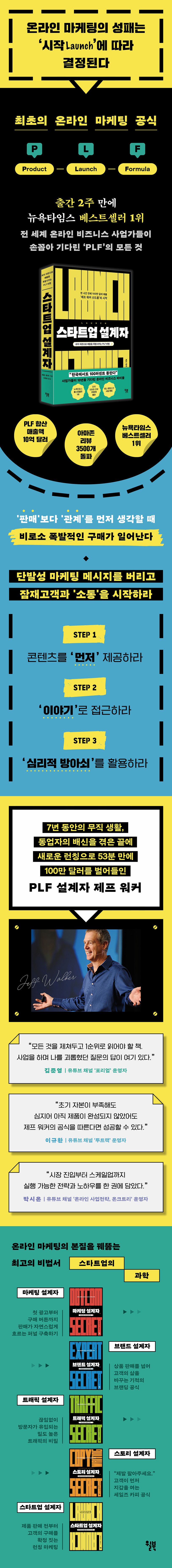 7년 동안의 무직 생활을 이겨내고 지하실에서 컴퓨터 한 대로 총합 매출액 10억 달러를 넘긴 마케팅 공식을 설계한 ‘제프 워커’의 첫 책 『스타트업 설계자』가 마침내 한국어판으로 출간되었다. 현지 출간 이후 2주 만에 《뉴욕타임스》 베스트셀러 1위에 오르며, 온라인 비즈니스의 바이블로 자리잡았고 눈 밝은 한국의 기업가나 마케터들 사이에선 이미 그 효과가 검증된 바로 그 책이다.