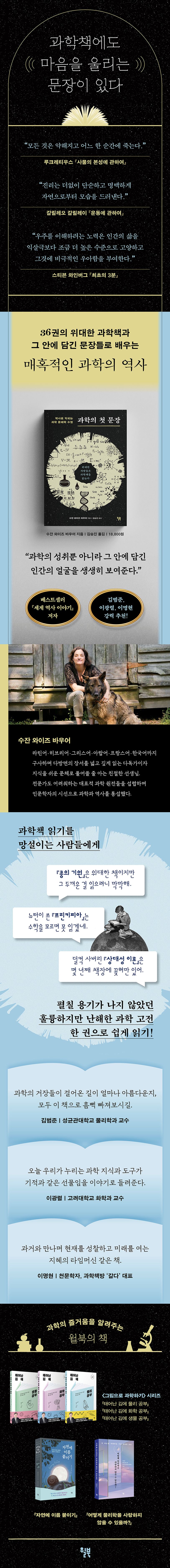 “이 창공의 방대함이 우리에게 보여주는 것은 지구처럼 반짝이는 수많은 다른 별들입니다.” 과학의 역사를 알면 과학책에 담긴 한 문장 한 문장이 다르게 읽힌다. 그 문장이 품은 지적인 훌륭함과 아름다움을 비로소 느낄 수 있다. 뜻밖의 발견을 했을 때 ‘유레카!’를 외쳤던 철학자 아르키메데스는 책 「모래알을 세는 사람」을 통해 인간이 이해할 수 없는 것은 ‘우주에 없다’는 메시지를 전했다. 뉴턴은 『프린키피아』를 통해 사과나무 아래에서 발견한 중력의 법칙을 우주 전체로 확장했다. 과학자들이 어떤 고민 속에서 새로운 발견을 해냈으며 그 발견이 세상을 어떻게 뒤집어 놓았는지 찬찬히 살펴보자. 그 과정에서 과학책 속 마음을 사로잡는 당신만의 첫 번째 문장을 발견하게 될 것이다.