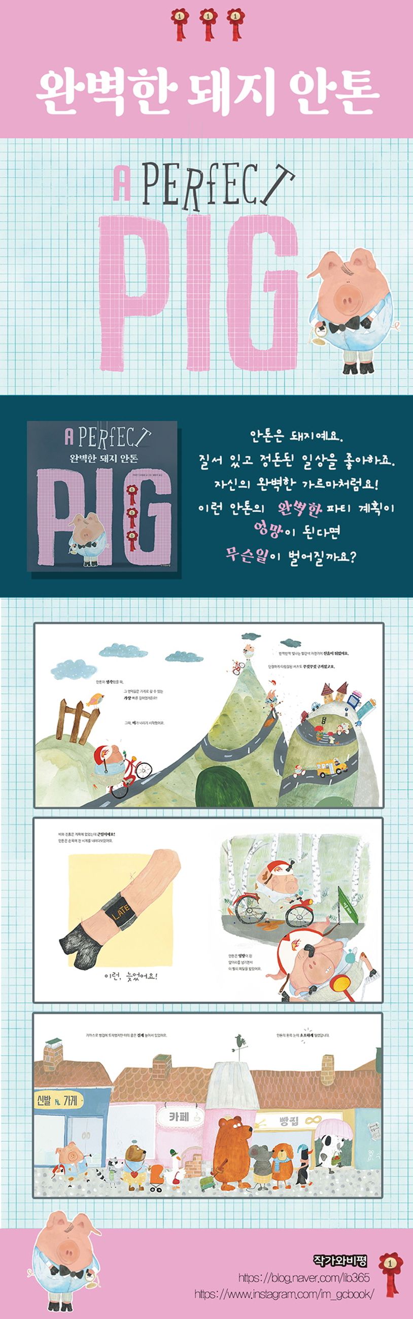 『완벽한 돼지 안톤』은 뭐든지 완벽하게 해내야 하는 돼지 ‘안톤’의 실수투성이 하루를 보여 주는 유아 그림책입니다. 질서 있고 정돈된 일상을 좋아하는 안톤은 아침마다 완벽하게 가르마를 타고 빈틈없는 동작으로 체조를 한 후, 정확한 각도로 아침밥을 먹곤 합니다. 이렇게 완벽한 안톤은 친구 롤라를 위해 완벽한 깜짝 파티를 해주려고 하는데요, 점점 그 계획은 안톤이 예상치 못한 방향으로 흘러가게 됩니다. 계획에 없던 비를 쫄딱 맞은 안톤이 허겁지겁 생일 케이크를 사려고 하지만 이마저도 다 팔리고 없었습니다. 과연 안톤은 계획대로 완벽하게 파티를 준비할 수 있을까요?
