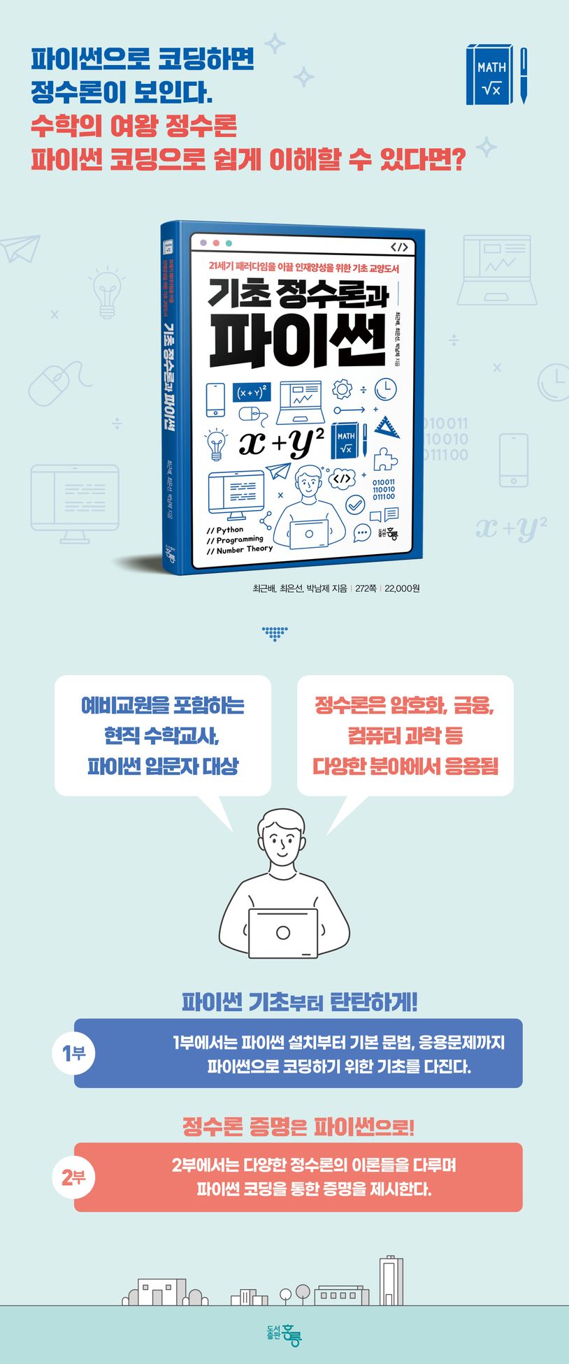 1부파이썬코딩기초제1장파이썬설치1비주얼스튜디오코드2구글코랩3아나콘다제2장자료형1문자2숫자3변수4리스트5딕셔너리6불리언제3장조건문1비교연산자2논리연산자3if~else조건문4if~elif~else조건문제4장반복문1for반복문2while반복문3break,continue제5장함수1내장함수2사용자정의함수3전역변수,지역변수2부정수론과파이썬제1장가분성1수학이야기-세계최초의수학교과서를쓴유클리드2나눗셈알고리즘3최대공약수와최소공배수제2장정수의표현과옛곱셈법1수학이야기-계산기가필요없는신기한곱셈법2정수의표현3곱셈법과이집트분수제3장일차부정방정식과산술정리1수학이야기-대수학의아버지디오판토스2수학이야기-에라토스테네스의체3일차부정방정식4소수5산술의기본정리6n!소인수분해제4장일차합동식과그응용1수학이야기-〈손자산경〉2합동식3중국인나머지정리4합동식의응용제5장페르마소정리와RSA공개키암호1수학이야기-페르마의놀라운발견2페르마의소정리3RSA암호시스템제6장오일러정리와원시근1수학이야기-오일러와한붓그리기2수론적함수3오일러θ함수4오일러정리5원시근제8장암호체계1수학이야기-〈황금풍뎅이〉속치환암호2비밀키암호화방식3공개키암호화방식