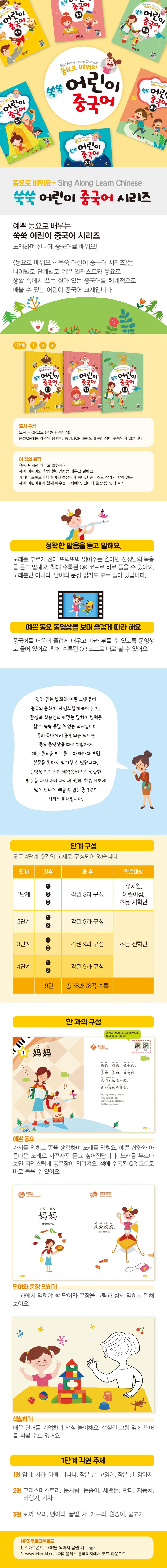 나이별로 단계별로 예쁜 일러스트와 동요를 통하여 생활 속에서 쓰는 살아 있는 중국어를 체계적으로 배울 수 있는 어린이 중국어 교재입니다.
