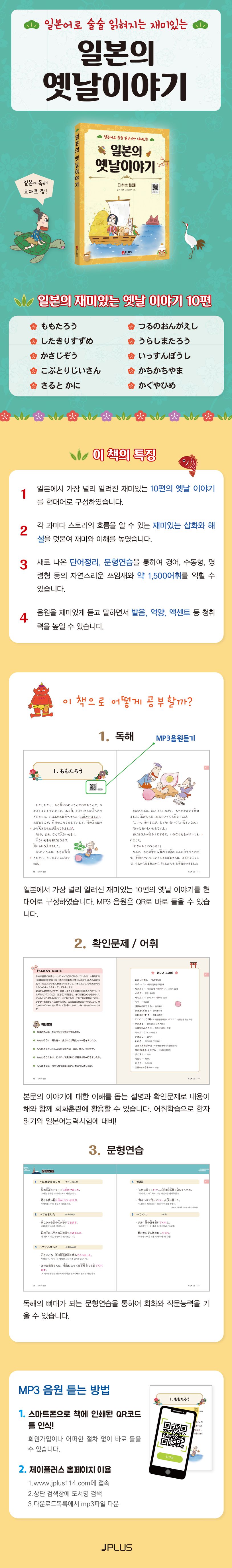일본에서 가장 널리 알려진 재미있는 10편의 옛날 이야기를 각 과마다 스토리의 흐름을 알 수 있는 재미있는 삽화와 해설을 덧붙여 현대어로 구성한 독해 교재. 새로 나온 단어정리, 문형연습을 통하여 경어, 수동형, 명령형 등의 자연스러운 쓰임새와 약 1500어휘를 익힐 수 있다.