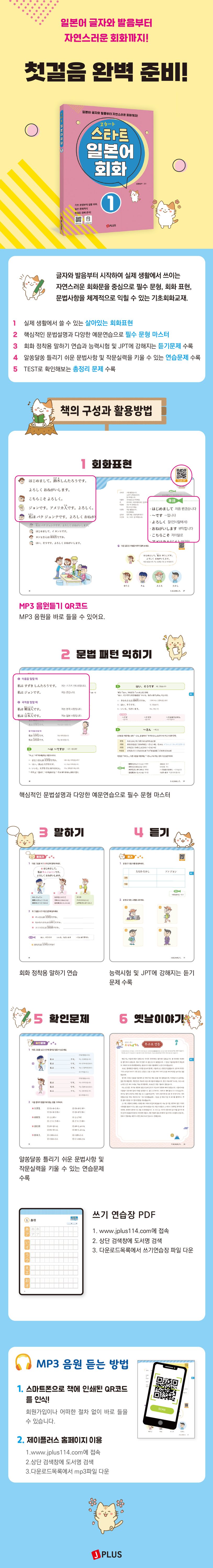 『스타트 일본어 회화』제1권은 일본어를 시작하려는 초보자를 위한 기초 일본어 교재이다. 글자와 발음부터 시작하여 실제 생활에서 쓰이는 자연스러운 회화문을 중심으로 필수문형과 회화표현, 문법사항을 체계적으로 익힐 수 있도록 구성하였다. 일본어의 기본 글자는 알지만 아직 말하기는 힘든 초보자들에게 적합하다.