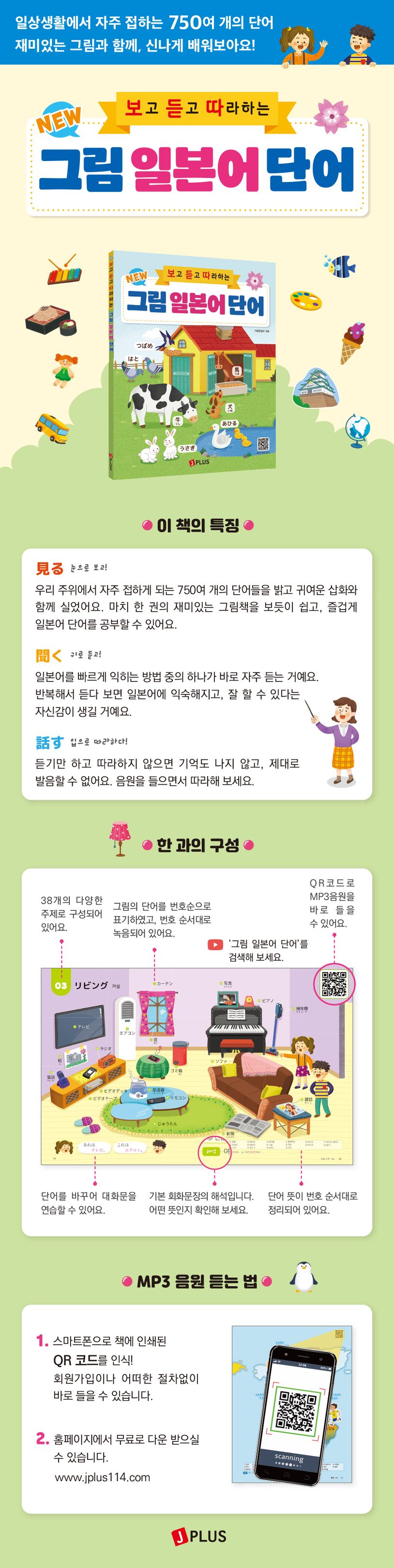 일상생활에서 자주 접하게 되는 750여 개의 단어를 재미있는 그림과 함께, 음원을 들으면서 신나게 따라하는 그림 일본어 단어집. 처음 일본어를 접하는 어린이나 일본어 기초 학습자가 알아두어야 할 기본단어 및 생활 단어를 중심으로 익히고, 그 단어를 활용한 회화표현을 연습할 수 있도록 구성되어 있습니다. 음원에는 번호순대로 모든 단어가 「한국어 뜻+일본어 남녀 각 1회」로 수록되어 있습니다.