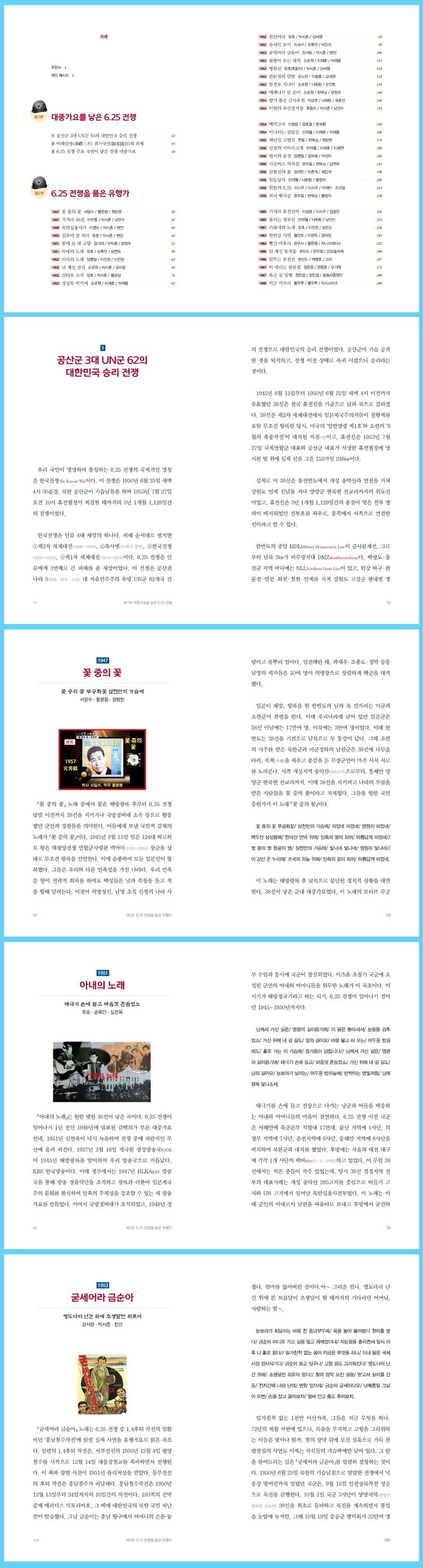 이 책은 6.25 전쟁 3년 1개월 1,129일을 모티브로 한 대중가요 유행가 61곡을 각각 독립적으로 스토리텔링한 르포에세이며, 전쟁기간을 살아낸 사람들의 그 당시 삶을 그 시절 관점으로 펼쳐드리는 것이 메시지다. 이 책은 6.25 전쟁을 대중가요 유행가로 반추하는 스토리텔링이다.