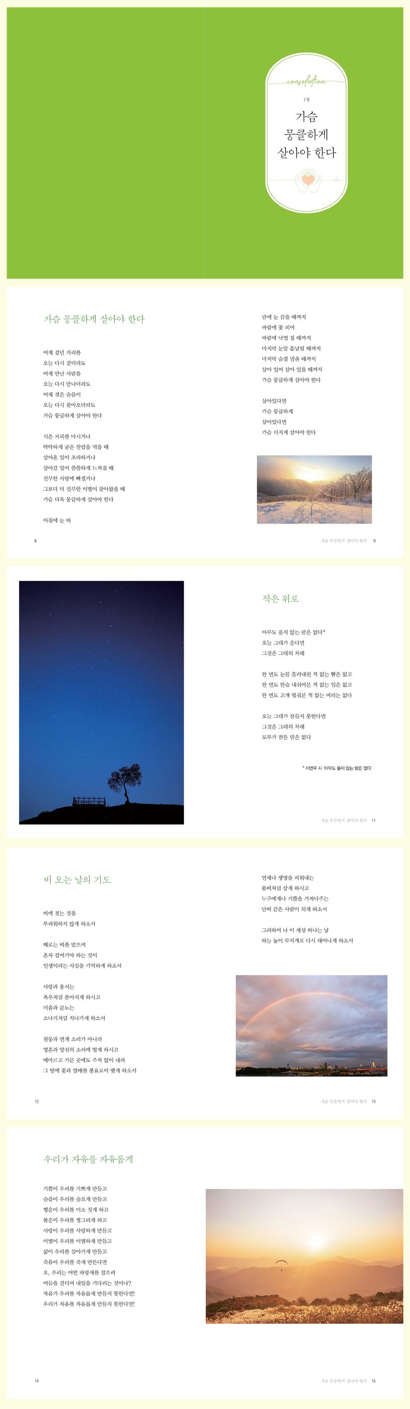 〈작은 위로〉에서는 ‘한 번도 눈물 흘러내린 적 없는 뺨은 없고, 한 번도 한숨 내쉬어본 적 없는 입은 없고, 한 번도 고개 떨궈본 적 없는 머리는 없다’고, 〈괜찮아〉에서는 ‘꿈이 없어도, 얼굴이 못생겨도, 키가 작아도… 실패하고 외로워도 괜찮다’고, 〈참 잘했네 그려〉에서는 ‘살아보니 조금은 분해도, 억울해도, 슬프고 힘들어도 묵묵히 살아오기를 잘했다’고 한다.