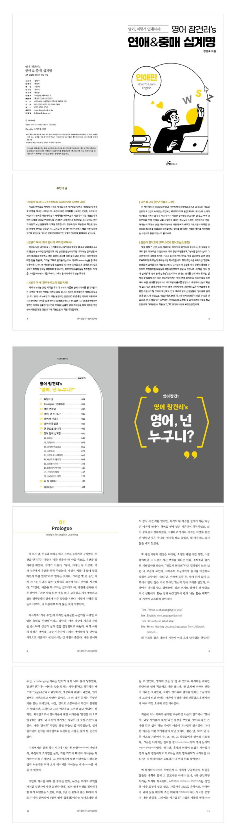 그렇다면 도대체 영어를 배우고 가르치는 방법은 어떠하여야 하는가. 본서는 그러한 질문에 대답하는 두 가지 파트로 구성되어 있다. 하나는 영어와의 연애, 즉 영어 학습법이고, 다른 하나는 영어를 중매하는 것, 즉 영어 교수법이다. 책 앞부분은 ‘연애편’으로, 뒷부분은 ‘중매편’으로 나누었다.