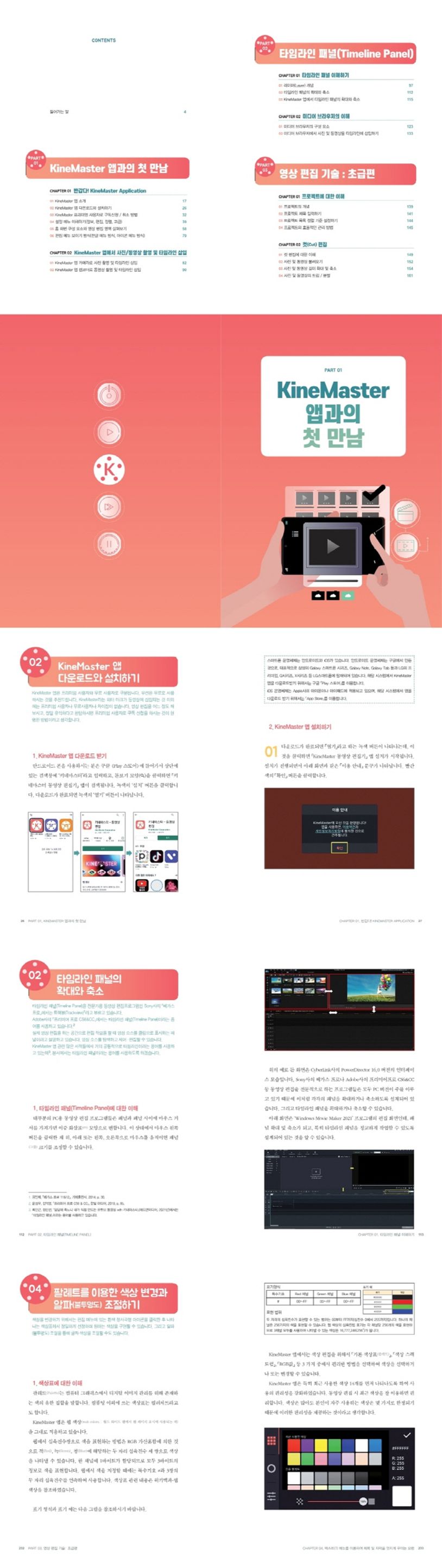 셋째, 동영상 편집 도중에 궁금한 내용이 생기면 얼른 찾아서 볼 수 있도록 백과사전식으로 Part ㆍ 장 ㆍ 절을 구성하였다. 이것도 다른 키네마스터 관련 서적들과 차별화되는 점이다.