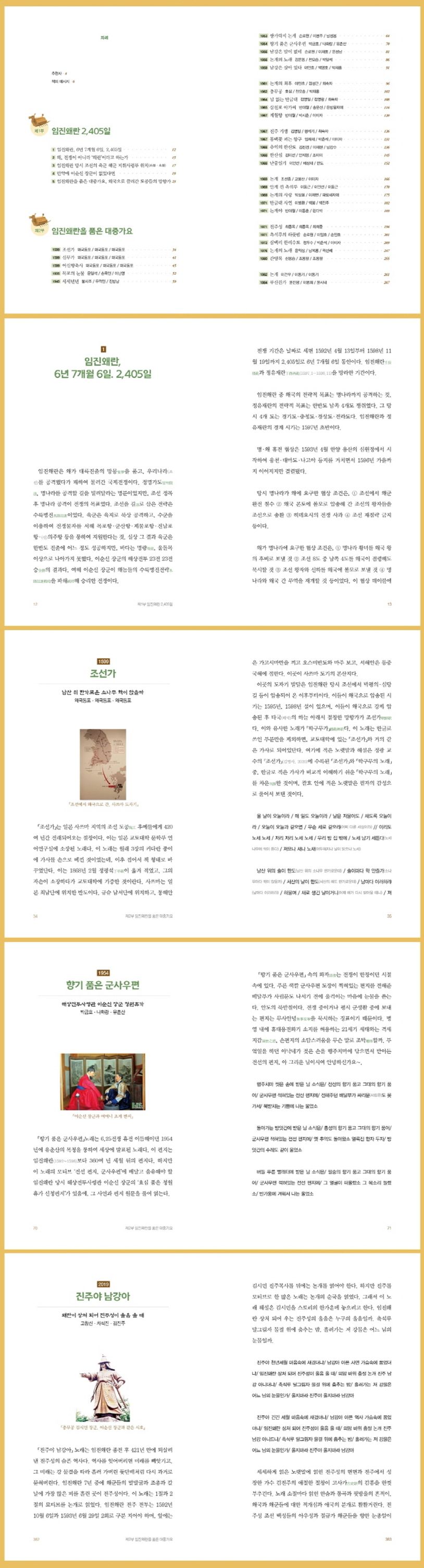 임진왜란 때 일본에 강제로 끌려가 정착하게 되었으나 뛰어난 기술로 일본 ‘아리타 도자기’의 시조가 되었으며 드라마 〈불의 여신 정이〉의 모티브가 된 실제 인물인 도기공 백파선의 애절한 삶, 남강에서 왜군 장구 게야무라 로쿠스케를 끌어안고 강물에 뛰어들며 순절한 것으로 알려진 의녀(義女) 논개의 실제 삶에 대한 추적, 『난중일기』에 낱낱이 묘사된 군신(軍神) 이순신 장군의 인간적이면서도 당당하게 빛나는 삶의 모습들, 임진왜란 당시에서부터 지금까지 백성을 버린 나약한 왕으로 여겨지는 선조 임금의 몽진에 대한 새로운 해석 등 유행가에 얽힌 임진왜란에 대한 다양한 스토리텔링은 우리에게 인문학적인 풍요와 함께 애국애족으로 단단하게 확립된 국가관의 필요성을 느끼게 해줄 것이다.