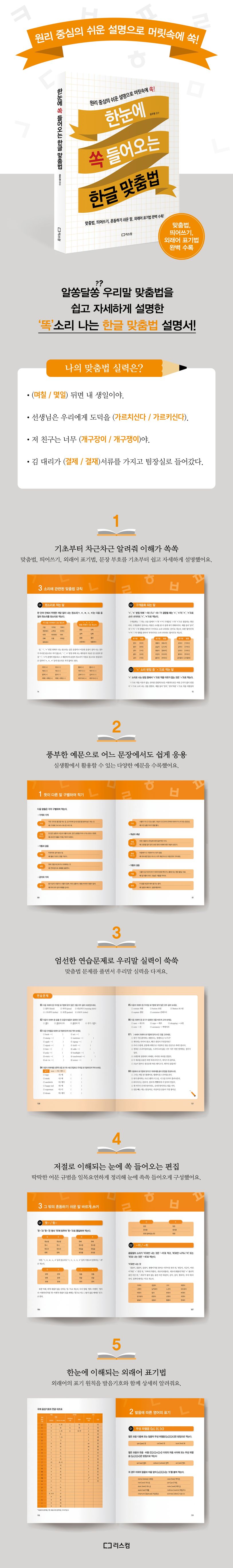 〈한눈에 쏙 들어오는 한글 맞춤법〉은 국립국어원에서 공표한 어문 규정을 바탕으로 하여 한글 맞춤법을 체계적이면서도 알기 쉽게 설명했습니다. 맞춤법과 띄어쓰기, 외래어 표기법, 문장 부호 등 규범은 물론이고, 혼동하기 쉬운 말과 한문 투의 말, 일본말에서 온 말 등 잘못 사용하는 말의 순화어까지 한 권에 담았습니다.
