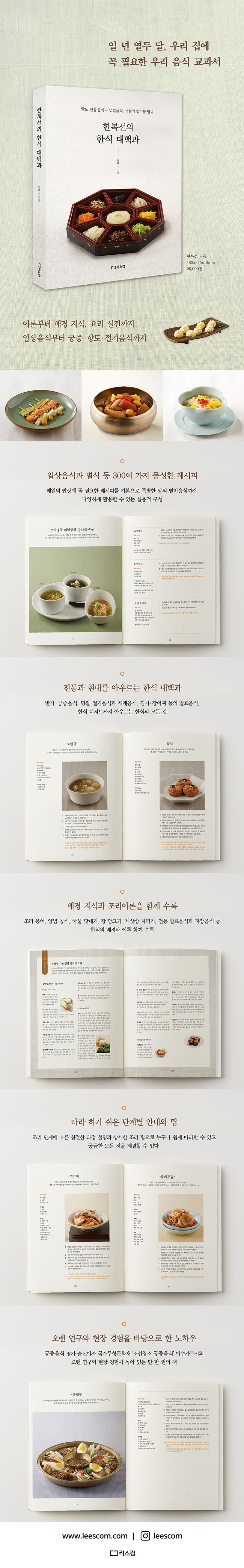 국·찌개·밑반찬등현대의일상음식부터반가의음식과궁중음식,절기나계절에따른음식,김치·장아찌와식혜·수정과등의한식디저트까지한국음식의모든것을담았다.오늘저녁메뉴부터특별한날의상차림까지메뉴선택의폭이넓고,상황에따라난이도와소요시간을가늠해고르기쉽다.